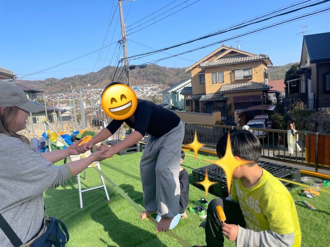 スラックライン 2025/03/28 こんにちは。 えがおがいっぱいです。 庭に新たな遊具が出来ました。 スラックライン!!大人気です。 渡るだけではなく、その場でピョンピョン飛び跳ねて楽しんでいます。 大人が教えるのは最低限のルールです。やりたい事を提供すると子供同士で考え、発想豊かな遊び方をしてくれます。 えがおがいっぱいでは、子供たちが楽しく学べるよう環境作りをしています。 見学や体験はいつでもOKです。 先ずはご連絡下さい。 TEL 0745-43-7851